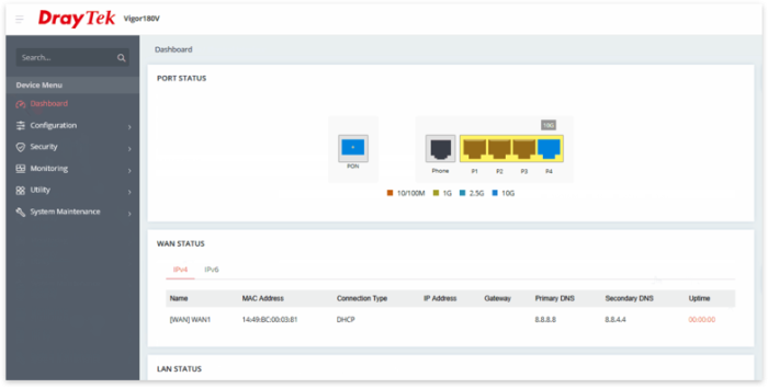 Vigor 180 so systémom DrayOS 5 má používateľsky prívetivé rozhranie, ktoré umožňuje jednoduchú správu siete. Vďaka prehľadu o stave siete v reálnom čase máte vždy kontrolu nad výkonom a pripojenými zariadeniami.