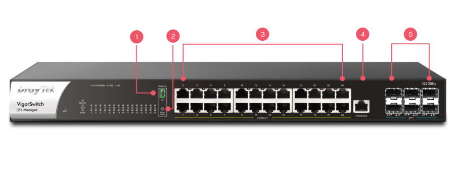 VigorSwitch Q2300x je riadený prepínač 2,5G vrstvy 2+ so šiestimi portami SFP+ (10G) a 24 portami 2,5G. 10-gigabitové uplinkové porty možno použiť na sieťové uplinky medzi prepínačmi, servermi a úložnými zariadeniami. Pri použití s prístupovými bodmi Vigor WiFi 6 (napr. VigorAP 962C) poskytuje Q2300x klientom LAN plný výkon WiFi 6.