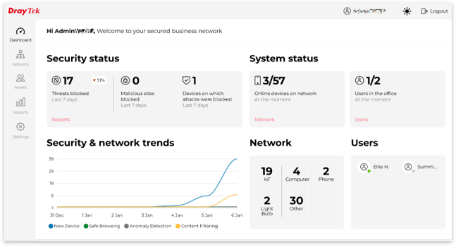 DrayTek kombinuje silné zabezpečenie s jednoduchým používaním. Kombináciou zabezpečenia na úrovni brány a cloudovej inteligencie v reálnom čase vzniká inteligentná ochranná vrstva, ktorá sa neustále učí a prispôsobuje novým hrozbám.