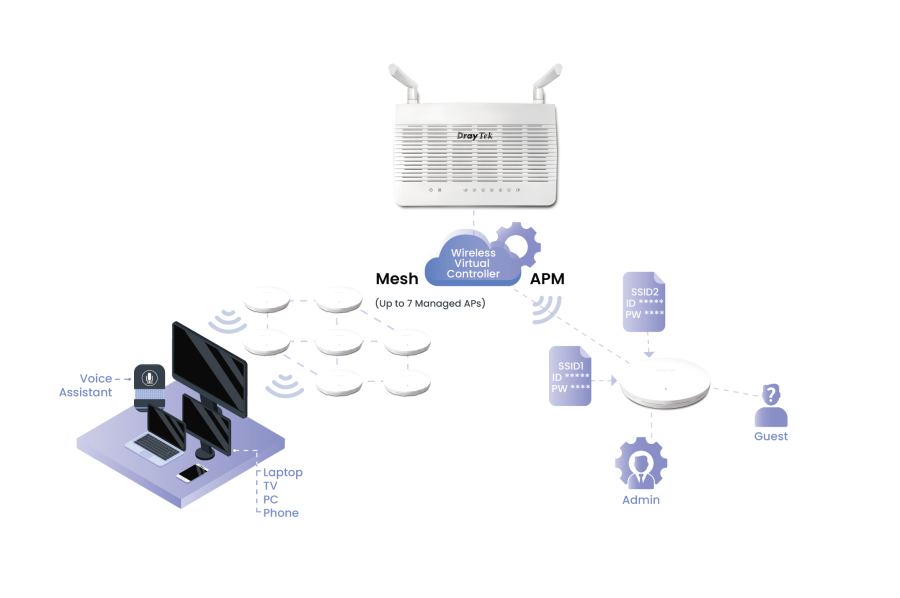 Vigor2136ax je nový router DrayOS 5, ktorý podporuje Virtual Controller a integruje protokoly Vigor Mesh aj AP Management. To umožňuje simultánnu správu viacerých prístupových bodov pripojených k rovnakej sieti prostredníctvom káblového alebo bezdrôtového pripojenia (s povolenou funkciou Mesh). Počet kompatibilných spravovaných prístupových bodov je určený zoznamom zariadení Virtual Controller: jeden koreňový prístupový bod (samotné zariadenie) a až sedem bezdrôtovo pripojených prístupových bodov. Celkový počet uzlov Vigor2136ax spravovateľných pomocou APM zostáva rovnaký ako maximum 20 uzlov, bez ohľadu na to, či sú káblové alebo bezdrôtové.
