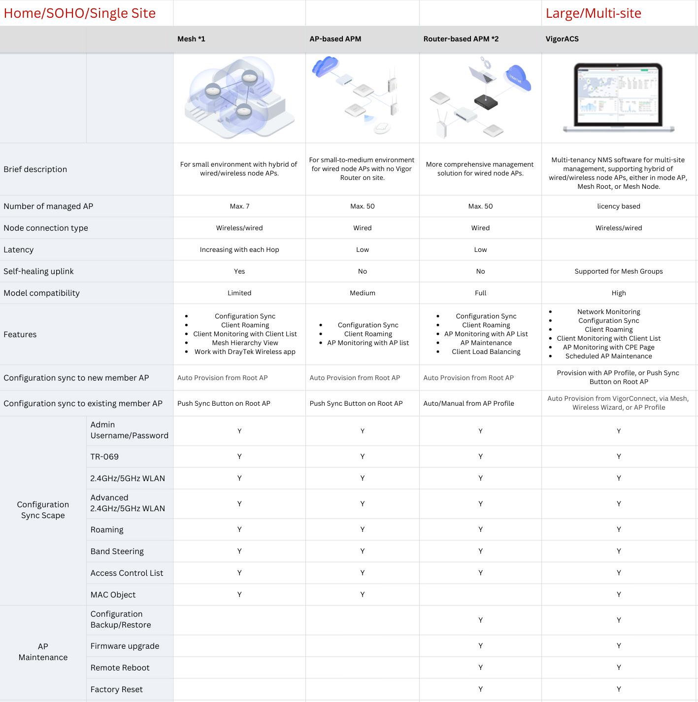 Od domácností/SOHO s niekoľkými prístupovými bodmi, cez stredne veľké kancelárie s desiatkami prístupových bodov až po veľké podniky s viacerými pobočkami, DrayTek ponúka rôzne riešenia správy prístupových bodov navrhnuté tak, aby zjednodušili každý scenár.